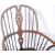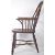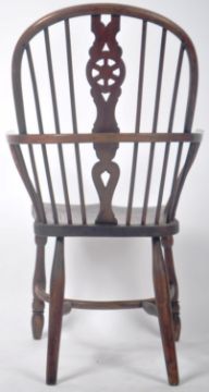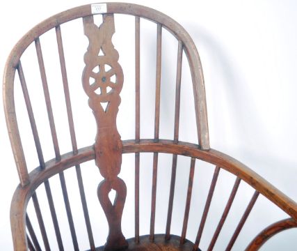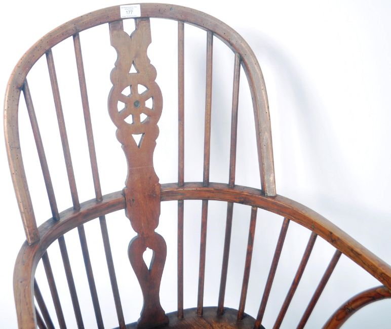 An antique 18th Century Georgian English Country elm wood Windsor chair armchair / elbow chair having a carved wood spindle come back with a single shaped wheelback slat panel. Shaped elbow rests and saddle panel seat all raised on turned and tapered legs united by a crinoline stretcher. Measures approx 106cm x 64cm x 50cm.