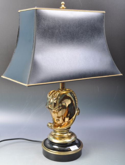 Deknudt - A good late 20th Century designer Hollywood Regency / Regency Moderne table / desk lamp having three bulb section over a central gilt brass horse head stem. Raised on circular sweeping base with gilt bands. Measures approx 65cm x 46cm x 23cm.