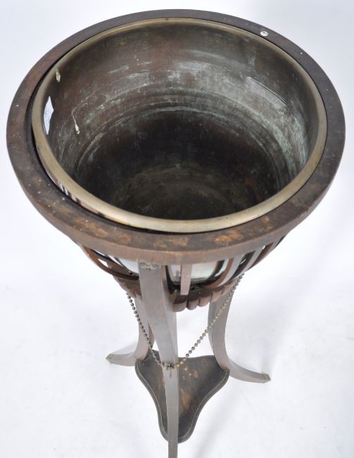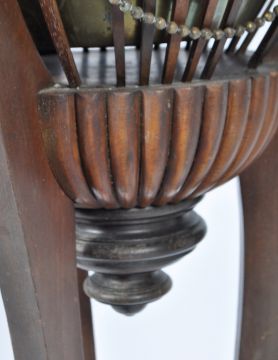 An antique late 19th / early 20th Century Victorian / Edwardian mahogany planter jardiniere stand having a brass inset bucket with slatted sides and ball bead finial chains throughout. Raised on tripod sabre legs united by trefoil lower tier and on brass cup feet. Stamped 24451 in inside. Some missing slats and one chain is loose but present. Measures approx; 102cm x 35cm.