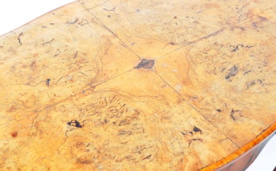 A 19th Century antique burr walnut centre table / library writing table desk / side occasional table of bombe form having a quarter panel veneer top with chamfered edge. Single secret drawer to the frieze and all raised on sabre legs. Measures: 72cm x 99cm x 64cm.