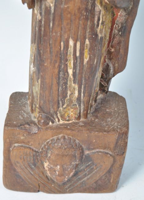 An antique 18th century antique limewood / lime wood carved religious figure of Mary. Mary with hands together in prayer, standing on a squared base with a carved cherub to the base. Remnants of original paint fragments to one side. Measures approx; 48cm.