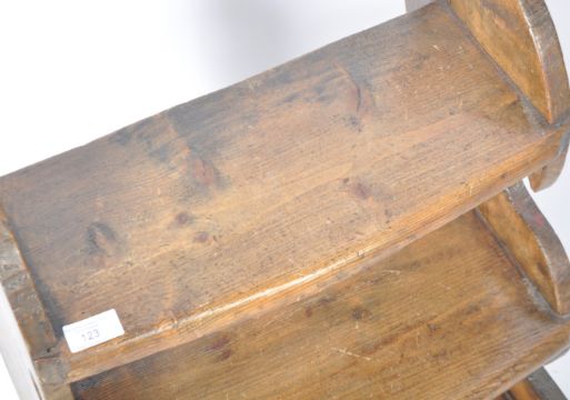 A set of antique late 19th / early 20th Century English library / shop steps of pine constructions. The rustic steps having shaped side panels with hook tops joined by three central steps. Measures approx; 73cm x 45cm x 32cm.