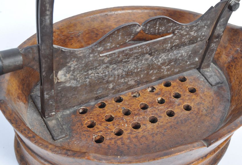 An 18th Century Georgian English antique Betel nut / Betel seed cutter of wrought iron and brass construction raised on a fruitwood tray base with drawer and pieced sections to the top. Usually East Indian examples found however this is a much more European example from a similar period. An unusual example. Measures: 28cm x 40cm.
