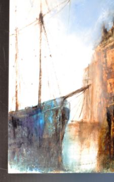 David Chambers (1946-present) - English Artist - An oil on board painting entitled ' Historic Bristol '. Depicts a sailing boat with dockside building, blue cloudy skies reflected into the water. Signed. Unframed. Measures approx; 39cm x 26cm.