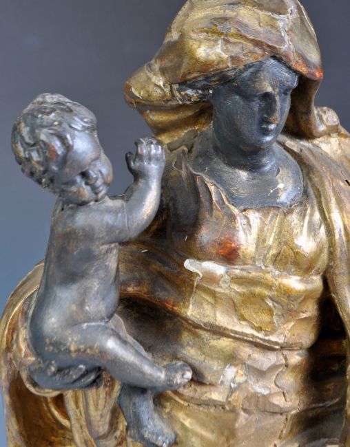 An antique 18th Century Religious Ecclesiastical carved limewood figurine of The Madonna & Child Christ. The figure having gilded clothing and ebonised features raised on a scrolled base. Likely an early Portuguese example. Measures approx; 41cm tall.