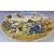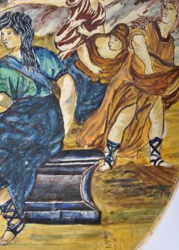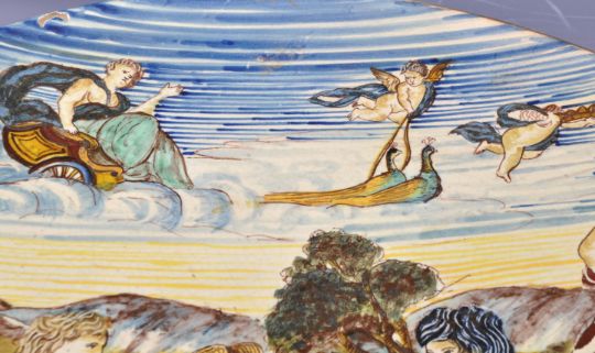 An antique early 20th Century Italian Renaissance Revival Maiolica Majolica tin glazed earthenware charger of large size having hand painted polychrome scenes depicting figures working the land with chariot in the clouds being drawn by two peacocks and putti. Measures approx; 38.5cm. Some minor chips to glaze / rim but no signs of major damage.