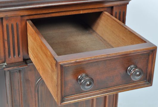 An antique late 19th / early 20th Century Victorian / Edwardian mahogany twin pedestal writing table desk in the manner of Gillows having a cigarette brown leather top with architectural front with central drawer flanked by a smaller drawer to each side The fascias having turned pull handles and framed borders. The pedestals of cupboard / cabinet form with hinged door opening to reveal a fitted shelf interior. Measures approx; 75cm x 123cm x 60cm.