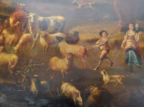 Nicolaes Berchem (1620-1683) - A 17th Century Dutch School artists oil on canvas painting depicting classical ruins with figures and cattle to the foreground. To the backdrop a large vineyard having a central homestead to the rolling hills with tree lines throughout. Signed and dated to the bottom left by the artist. Mounted on to a wood panel back. Unframed. Measures approx. 64.5cm x 104.5cm.