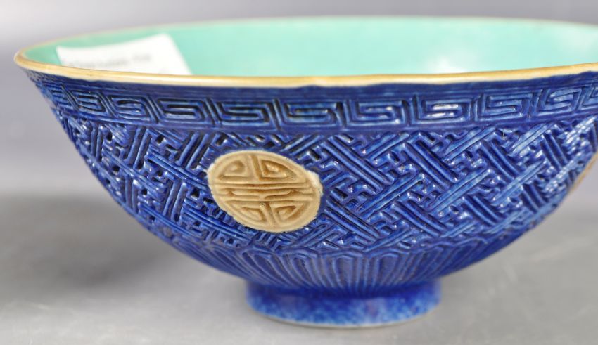 A matching pair of antique 19th Century Chinese Oriental bowls having duck egg teal painted interiors with gilf finished rims. The exterior of each having patterned decoration with Greek key finished border and gilt finished shou symbols with all being finished in cobalt blue. Each raised on a circular foot. Each measures approx; 5cm x 10.5cm diameter.