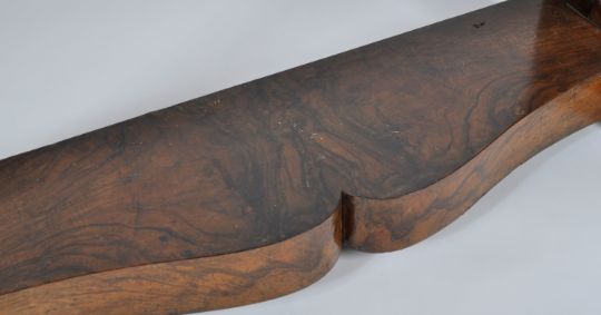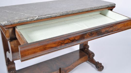 An impressive antique 19th Century Continental walnut and marble console table / side occasional table having a grey veined ' fossil ' marble top with shaped front and hidden drawer to the frieze. The large scroll supports terminating in a lower tier raised on carved hairy paw feet. Measures approx; 89cm x 117cm x 50cm.