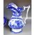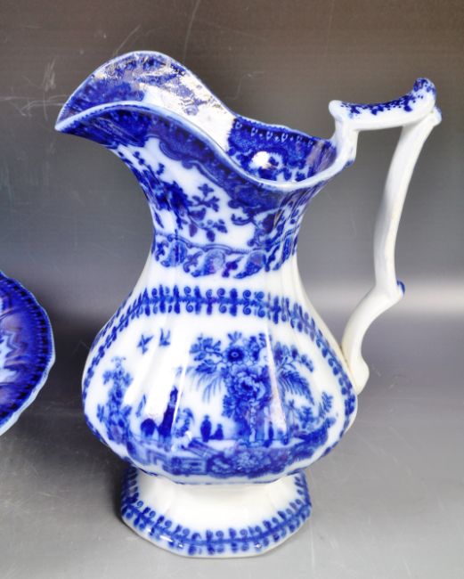An antique mid 19th Century Victorian flow blue blue and white water jug ewer / wash jug and basin bowl. The jug with shaped handle, raised pouring lip and segmented body decorated with scenes of figures, trees and birds. The bowl with further decoration. Condition; some hairlines, some minor wear or small chips. Measures approx; 29cm tall.