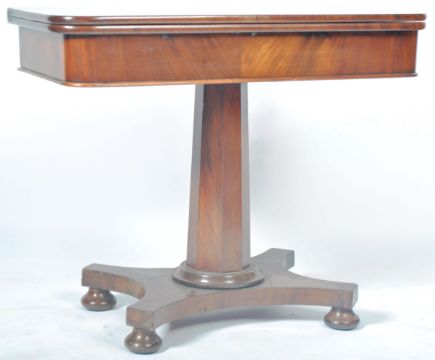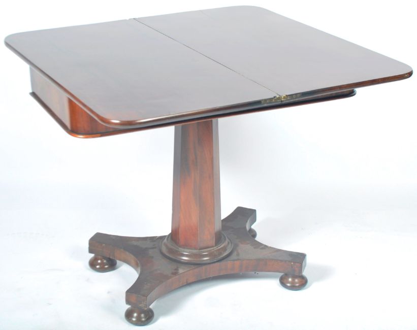 An antique William IV mahogany tea table / side occasional serving or coffee table having a fold over square / rectangular top with rounded corners swivel top revealing an internal storage area. The table top raised on an octagonal column over quatrefoil base with bun feet. Measures approx; 75cm x 92cm x 46cm. (92cm when extended)