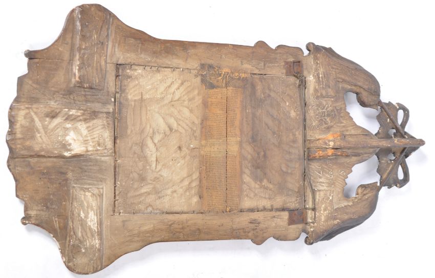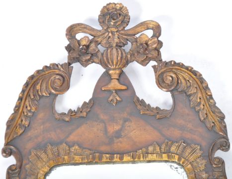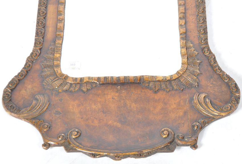 A believed early 18th Century Queen Anne English carved walnut wall mirror / pier mirror of large size having a floral medallion top with urn, scroll and floral detailing. The central inset mirror panel having carved border with further carved details, acanthus leaf and 'C' scrolls. Some remains of parcel gilt present. The back carved with an armorial crest and dated London WS 1714. Measures approx; 105cm x 48cm