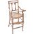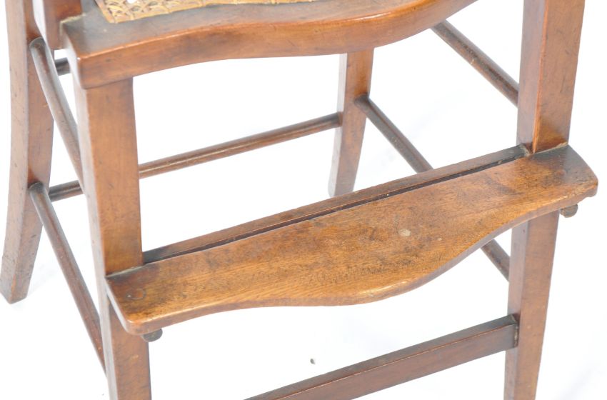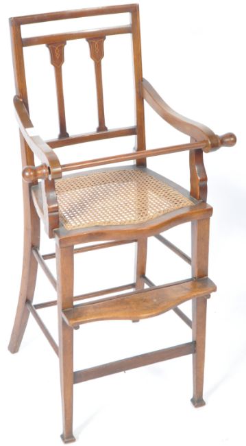 An antique early 20th Century Edwardian Arts & Crafts mahogany and line inlaid childs / childrens highchair. The high chair having a twin splat back with inlay details, shaped armrests united by locking bar and woven cane seat. Raised on shaped tapering square legs with footrest and splayed back legs united by peripheral stretchers. Measures approx; 92cm x 48cm x 41cm.