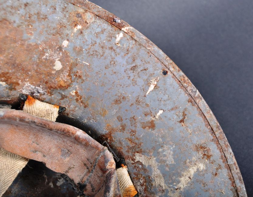Two original WWII Second World War British Army steel combat helmets. The helmets comprising a 1939 dated brodie helmet with leather liner and chin strap by makers Briggs Motor Bodies of Dagenham and a 1941 Fire Wardens Zuckerman helmet by makers Rubery Owen & Co Ltd of Leeds. Relic type condition with original F.G for Fire Guard painted to the front.