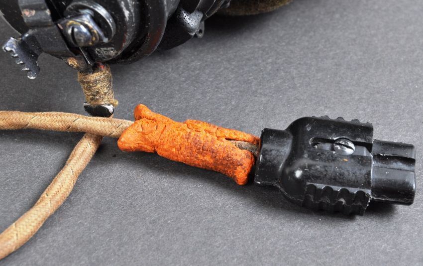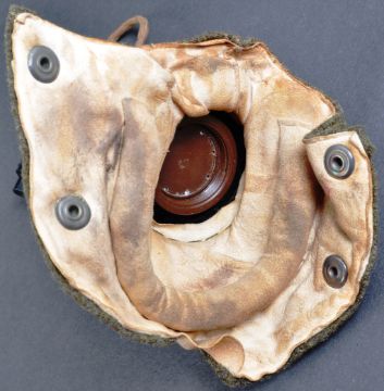 A WWII Second World War type RAF Royal Air Force Type D Flying Helmet Oxygen face mask. The oxygen mask stamped with Air Ministry markings and dated 1938. Various official stampings present to the front, including the stores reference codes and part numbers. Retains a portion of the original plug-in cord. Provenance unknown, some areas possibly later additions. Buyer discretion advised.