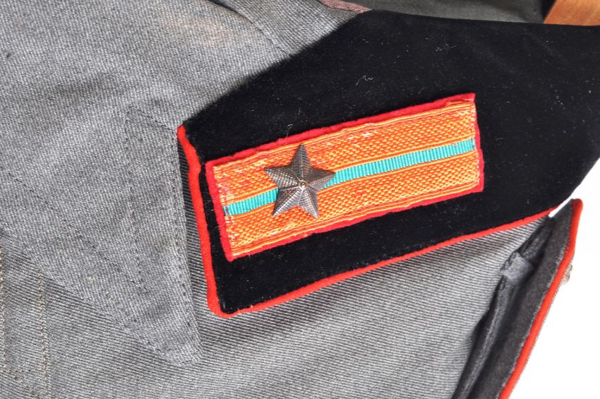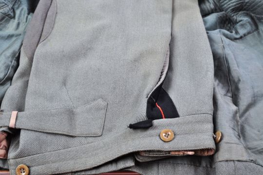 An original WWII Second World War era Italian Army Officer / Infantry Officers uniform comprising dress tunic and trousers. The field grey tunic / jacket bullion Infantry badges to each shoulder epaulette and gorget patches to the black velvet faced collar. Captain rank stripes to each sleeve. Complete matching with uniform trousers.