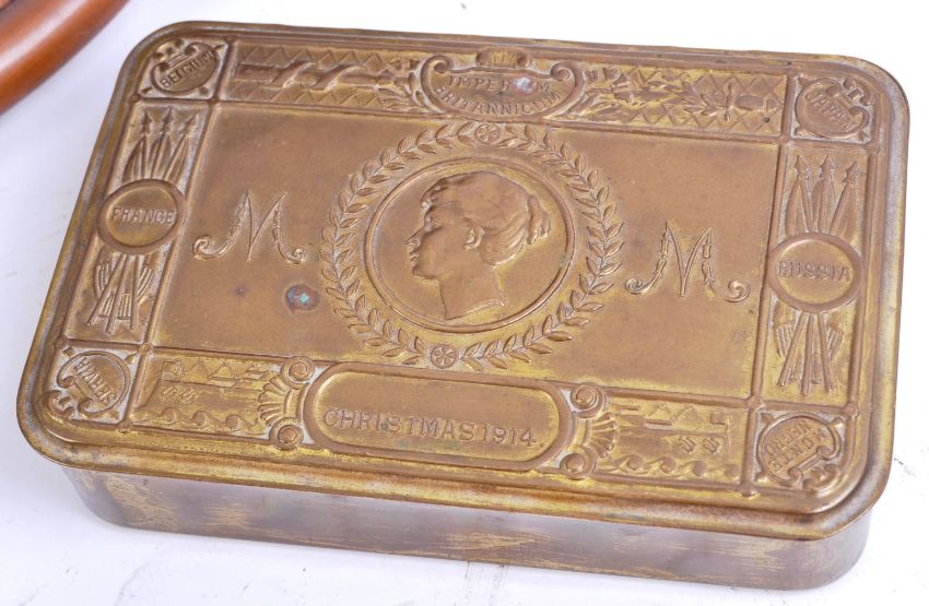 An original WWI First World War Princess Mary Christmas 1914 Gift Tin. Brass construction, generally in good condition with no splits. Void of any original contents. As sent out to all serving troops in the Army and Navy for Christmas 1914. 13cm long. Along with a similar period copper Bugle of typical form.