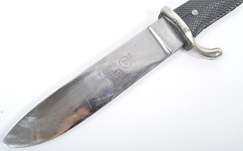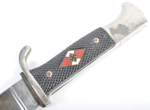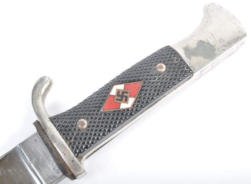 An original WWII Second World War German Nazi Third Reich HJ Hitler Youth dagger / knife. The dagger having a hooked pommel and black chequered grips with the enamel Hitler Youth emblem to one side. The backwards facing quillon / knuckle guard leading to a wide short steel blade stamped for makers  ' H & F Lauterjung W. Solingeit '. RZM M7/6. Complete with original steel scabbard and leather belt frog. Measures; 26cm overall.