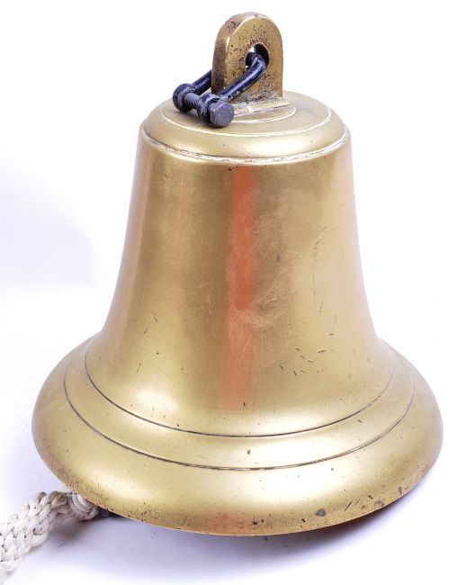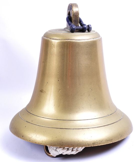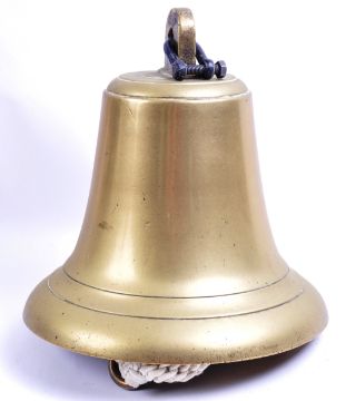 A large vintage early 20th century heavy brass construction Ship's masthead type signal bell. Complete with clapper and shaped metal mounting bracket. Bell body measures approx; 35cm tall.