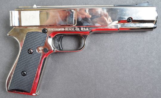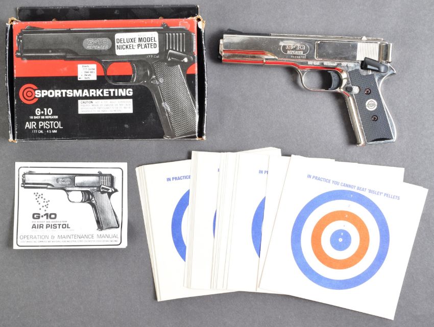 A vintage Sportsmarketing made G10 18 Shot BB Repeater Air Pistol. Housed within its original box. Chrome effect air pistol, with front-loading mechanism. With paper targets present. Appears in working order.