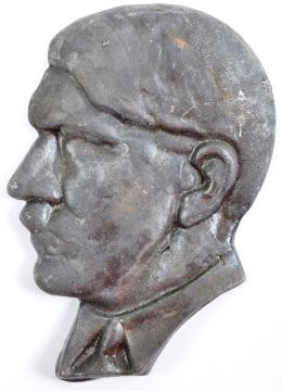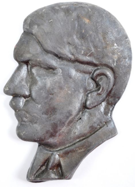 An original pre-WWII Second World War c1930s German metal relief bust of Nazi Party leader Adolf Hitler. Heavy metal construction, depicting a right-facing Hitler, with shirt and tie. No maker's marks. Measures approx; 16cm tall.