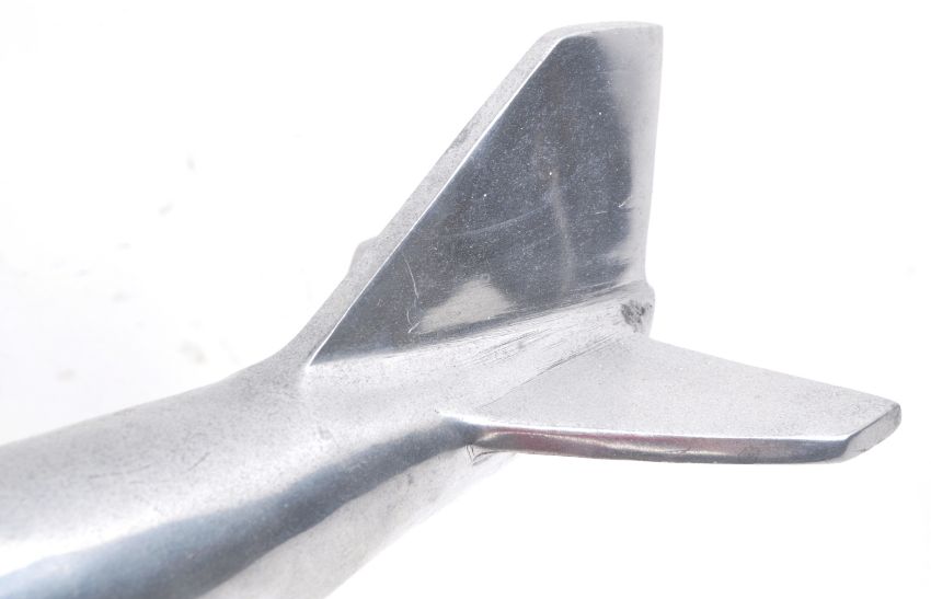 An impressive mid 20th century Art Deco travel agent's office display point of sale aeronautical interest polished aluminium / chrome scale model of a jet plane aeroplane having a pointed nose with raised cockpit, twin wings and trefoil back rudder and stabilisers. Raised on a tall cylindrical column over a stepped circular base. A fantastic display piece. Measures: 40cm x 42cm x 40cm.