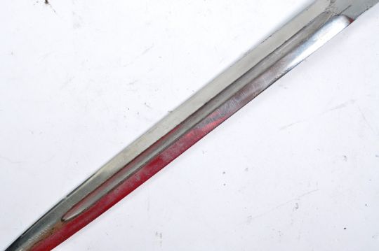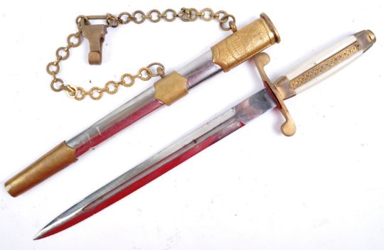 An original WWII Second World War era Bulgarian Communist Officers parade uniform dress dagger. The dagger having a star to the pommel and cream celluloid handle with brass furniture. The shaped crossguard leading to a double edge polished blade housed in a steel scabbard. The scabbard having a brass collar depicting the Bulgarian Lion rampant to one side and Moscow Red Square to the other. Measures approx 35cm.