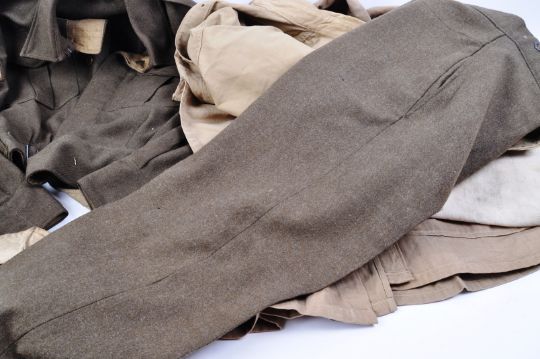 A collection of WWII Second World War Royal Engineers Staff Sergeant uniform items comprising his 1942 / 43 dated Australian made battledress blouse and trousers, the blouse having his x3 chevrons rank to the upper arm and plastic crowns, x2 tropical / khaki drill tunics each with x4 pockets and a 1943 dated wash kit roll. All contained in a white early pattern canvas kit bag, named to the front Staff Sergeant Richardson.