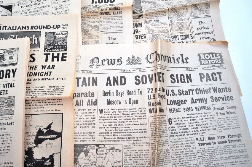 A collection of original WWII Second World War interest British newspapers. Various headlines to include; Nazis Invade, Hitler Escapes Explosion In A Beer Cellar, The Blasting Of Dresden, Roosevelt Dies On Eve Of Allied Triumph, Sweden Bows To Nazi Ultimatum, Big Hun Losses In Dieppe Battle, Battle In Crete, Rome Falls, Fall Of Singapore, Bismarck - The First Full Story, Italy Takes The Plunge, Britain And US United For Victory, Biggest Air Raids Of All (Battle Of Britain), Japan Declares War Britain And America (Pearl Harbor). Fascinating content. Large collection.