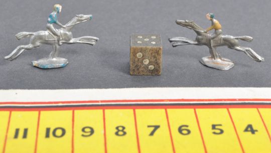 WWII Second World War - an unusual WWII period Horse Racing board game, purchased some years ago from the estate of one H. Thomson - believed to have been a Navigator attached to a Halifax Bomber crew during the war. The board game comprising of a cardboard playing board, wooden dice, and two lead playing pieces. The game marked to reverse ' H. Thomson RAF '. The game was always presumed to have been sent to his camp (said to be Stalag Luft 1) by Red Cross aid parcels or similar. An interesting piece of history.