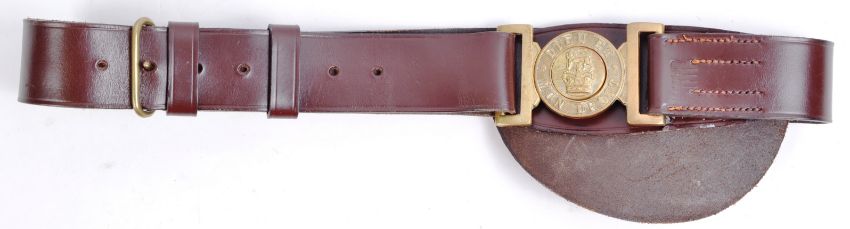 An original 20th Century British Army officers Sam Browne type uniform belt. Brown leather construction with brass ' Dieu Et Mon Droit ' buckle depicting the Lion and Queens crown.