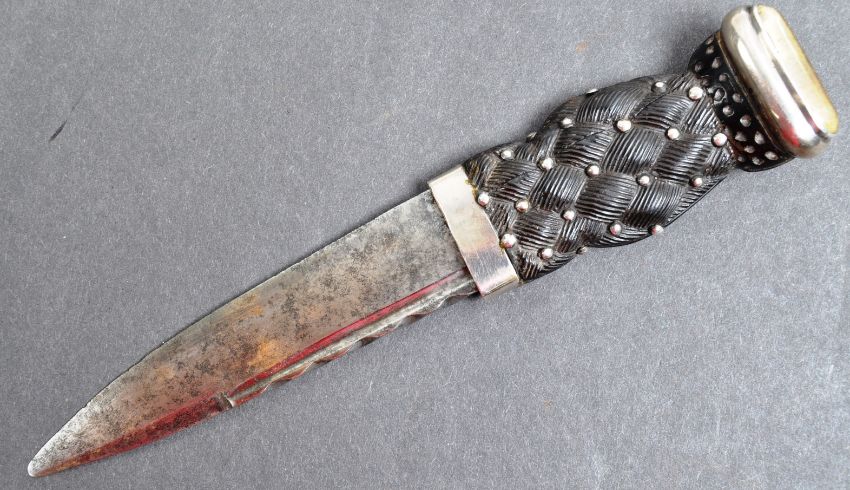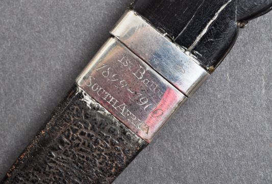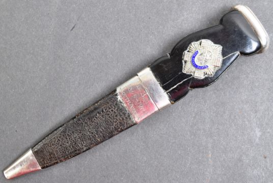 A 20th Century Royal Scots ' Sgian-Dubh ' dress dagger of Boer War interest. The traditional knife having a white metal pommel set with a glass stone and a textured woven grip bearing a white metal badge of The Royal Scots regiment. The leather wrapped scabbard engraved to the metal collar ' 1st Battn 1899-1900 South Africa '. Measures approx 20cm.