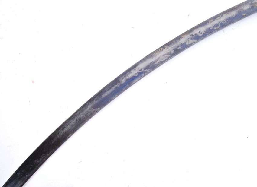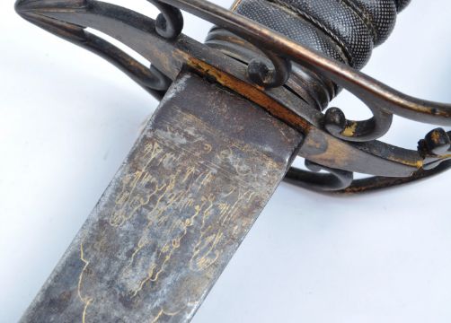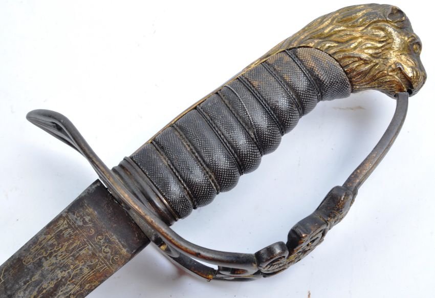 A 19th Century antique George III 1803 pattern British Infantry Flank Officers sword / sabre. The sword having a lions head to the pommel and a wire bound fish skin covered grip. The brass pierced basket guard having the crowned GR cipher. The curved blade etched with gilt scrollwork housed in a leather wrapped scabbard with brass furniture. Measures approx 90cm