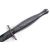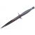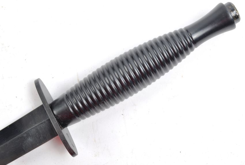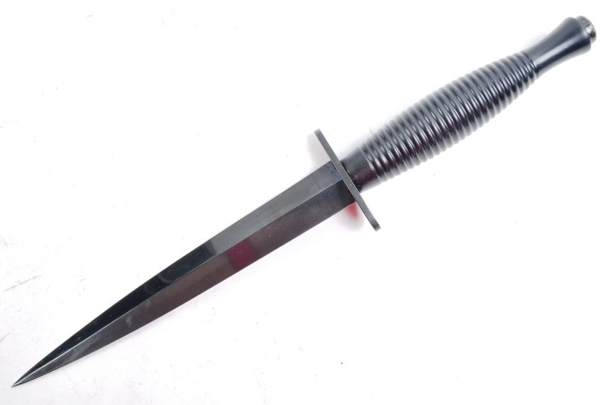 An original current issue FS Fairbairn Sykes British commando knife dagger. The knife having a nut to the pommel, ribbed handle and a gross guard stamped with broad arrow marks and ' Sheffield England '. The ebonised steel blade housed in a black leather scabbard. Measures approx 30cm.