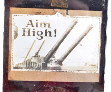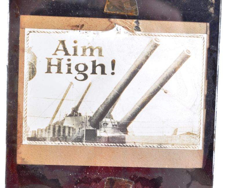 A collection of x12 antique c1900 Military and Navy related glass Magic Lantern projector slides. Includes slides titled ' Torpedo Blowing Up Boat ', ' Mine Filling ,' 'Aim High,' 'Scots Greys' and others. Most Naval related showing views onboard warships of the period. 8x8cm.