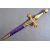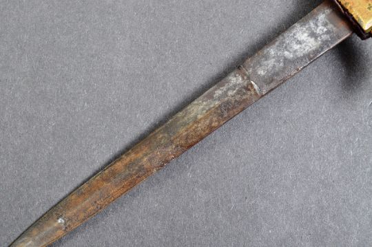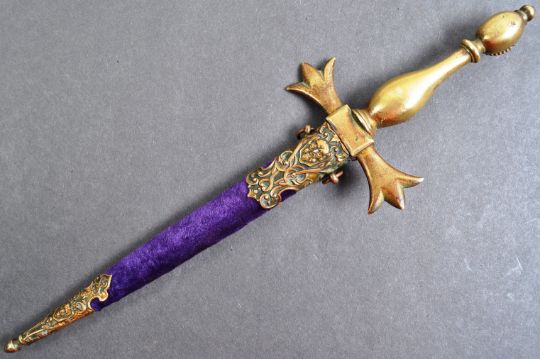A 19th Century antique ' Memento Mori ' South European dirk / dagger. The dagger having a brass pommel and hilt inset with faceted cut Amethyst stones and a twin 3 petal cross guard. The double edged blade housed in a purple velvet wrapped scabbard with brass furniture depicting Satan and other gothic symbols. Measures approx 30cm.