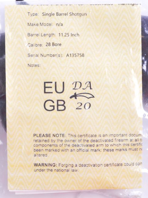 An original American made Harrington & Richardson 28 bore sawn-off shotgun - deactivated to EU standards (Mar 2020). Maker's marks impressed to lock plate, with serial number A135758 to other side and various proof marks to top. With certificate. Measures approx; 47cm long.