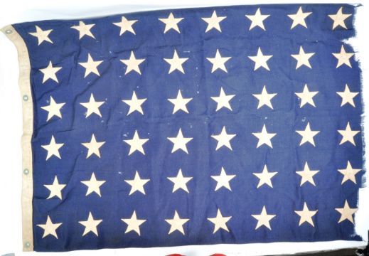 HMS LST-420 - a scarce original WWII Second World War period American US Navy ' Union Jack ' flag featuring 48 sewn white stars on a blue ground. The seam officially stamped ' Union Jack ' with a period handwritten ' HMS LST ' just visible to seam and the number ' 4' (likely of 420). Retains original brass grommets. With some later printed history. Some light wear from use, but generally good original condition. Measures approx; 82cm x 119cm. From a large private collection of militaria, amassed over many years.