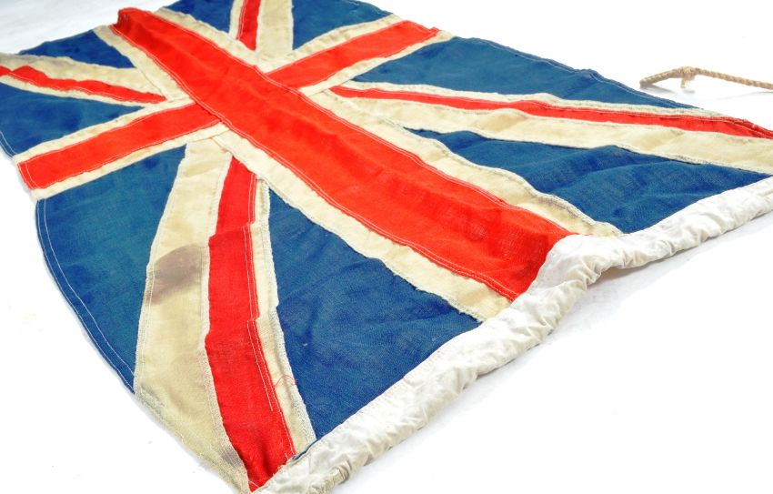 An original vintage WWII Second World War era mid-20th Century British Union Flag / Jack. Typical red, white and blue form. Stitched construction. Undated. With original wooden toggle. Measures approx; 59cm x 139cm.