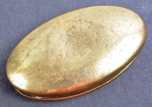 Local Bristol Mining Interest - An early 20th Century antique small brass tobacco or snuff box, punched to top Thomas Angel Two Mile Hill 1909 Kingswood. Thomas was born in 1850 in Soundwell Bristol South Gloucestershire and was a general labourer in the Bristol coal mines.  The oval hinged box measuring approx 8cm