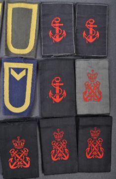 A large collection of assorted WWII Second World War and other British Navy uniform cloth patches and rank slides comprising various Royal Navy ranks along with some woven batches relating to German Berufsfeuerwehr Stuttgart Fire Brigade, a green German / Berlin City police patch and