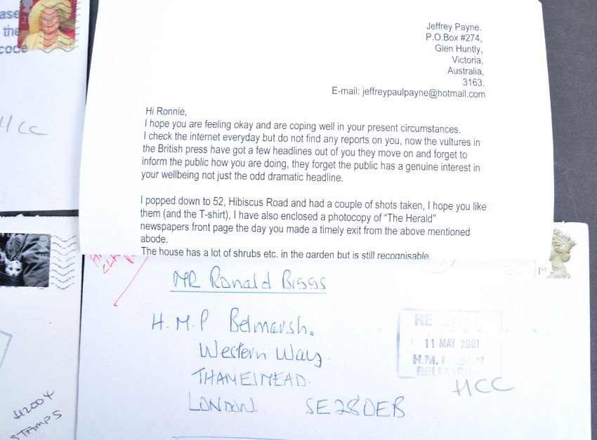 The Great Train Robbery - Ronnie Biggs (1929-2013) - a collection of personal correspondence to Biggs from various people / fans. Includes; a letter from one Bill Sykes addressed to Biggs at HMP Belmarsh, a letter from a fan with enclosed photographs taken outside Biggs' home in Australia, a letter rather humorously addressed ' Mr Ronald Biggs - Great Train Robbery - Rio De Janeiro ' (which did make it to Biggs), a letter addressed to Biggs c1981 in Barbados congratulating him on 'being free', a Christmas card, envelope to HMP Belmarsh etc. Interesting and unique collection.