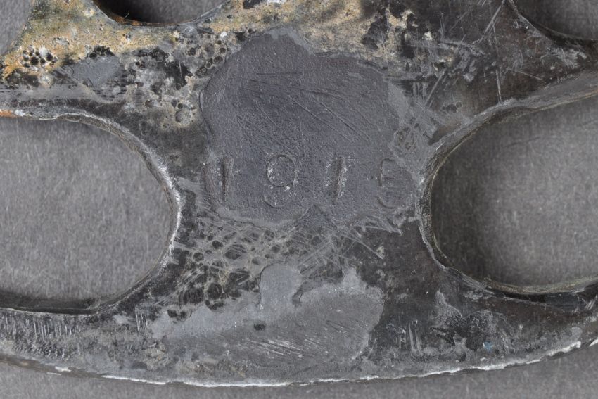 An original WWI First World War believed British Army knuckle duster / brass knuckles. Typical form, likely steel construction, with shaped finger holes and palm grip. Dated to one side ' 1915 '. Measures 9.5cm long.