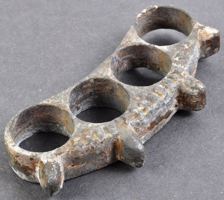 A rare original WWI First World War Imperial German Army Austrian made trench warfare knuckleduster / knuckle duster. c1915 construction. Steel construction, with raised makers marks for N. Steinbruck, Graz to front and ' 2106 ' to rear. Spiked knuckle section, the grip of curved form with four symmetrical holes for fingers. Scarce piece of trench weaponry. Measures approx; 11cm long.