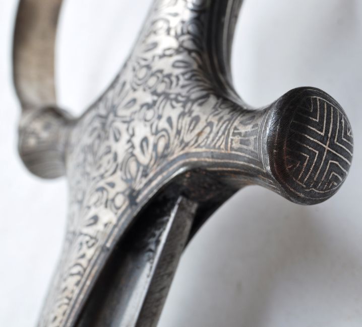 An antique late 19th Century Indian Tulwar ( Talwaar / Talwar ) sword. The sword having a disk shaped pommel with spike, swollen fluted grip and knuckle guard all heavily decorated with floral scrollwork. The cruciform cross guard leading to a long curved single edged blade. Measures approx 98cm.