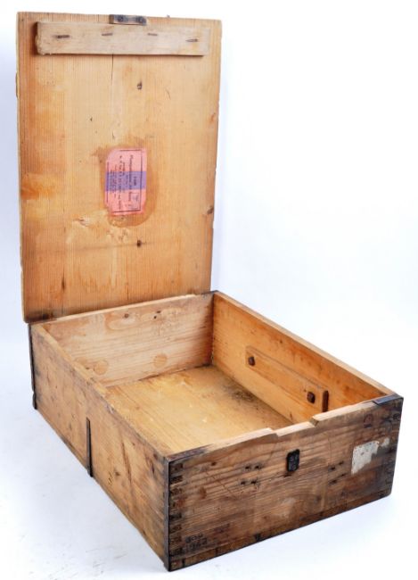 A WWII Second World War Third Reich Nazi German ammunition / ammo box. The adapted wooden box having a label to the inside lid with Waffenamt code (WaA) inspection mark and eagle and Swastika stamp. The German text translating to ' Blank Cartridges 33 Type I '. Measures approx 16x48x35cm.
