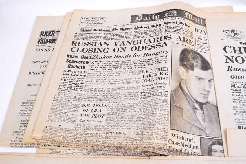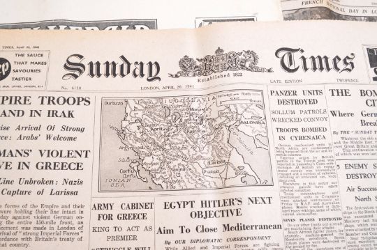 A collection of original WWII Second World War period wartime British newspapers. Various headlines to include; 200 US Warships Out Raiders-Spotting, Coventry Homeless Slept By Roadside This Morning, Mr Churchill And An Invasion, The Time Is Short, Dakar Expedition Is Off, Australia To Prepare Attack, Fall Of Singapore, Empire Troops Land In Irak, and many others. All complete papers. Much interesting content.