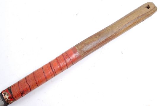 A WWII Second World War Japanese Army bamboo cutting Ryoba knife / sword. The sword having a long wooden handle half wrapped in tape and a thin flexible serrated blade with Japanese text to the ricasso. Measures approx 60cm.