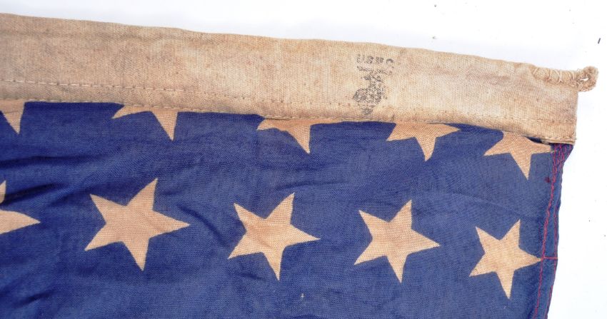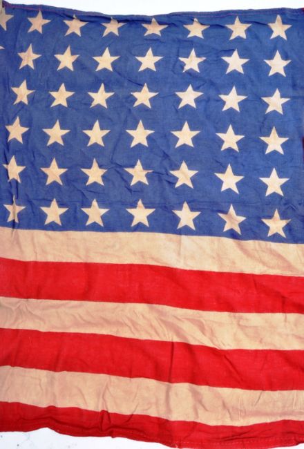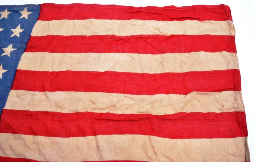 An original WWII Second World War period US Army / Marine 48-star American Flag. Printed stars and stripes, cotton construction. The seam stamped ' Boston US 1942 '. Flag of some vintage, but exact age is unknown and buyer discretion is advised. Total size approx; 59cm x 94cm